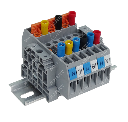 São indicados em circuitos onde se requer a inserção de instrumentos do tipo amperímetro, voltímetro, etc., como também operações de seccionamento elétrico, além da possibilidade de curto-circuitar secundários de transformadores de corrente. Não entendeu? veja alguns exemplos: 1 - Imagine que num painel elétrico você tem 3 amperímetros sendo um deles acabou de estragar/queimar, ou seja, você precisará fazer a troca. Sabemos que um transformador de corrente (TC) jamais pode ficar com as pontas abertas por muito tempo, correto? Usando o bloco de aferição você poderá curto circuitar o TC com segurança, fazer a troca do amperímetro e voltar a posição inicial. 2 - Voce tem dúvidas se o TC esta funcionando corretamente, mas não quer ou não pode desligar os fios do equipamento de leitura da corrente. Usando o bloco de aferição este trabalho será simplificado, seguro e extremamente rápido. 3 - Precisa fazer um ensaio no medidor instalado com um gerador de corrente externo, ou seja, quer tirar o TC do circuito e conectar o novo gerador. Não quer ou não pode desligar os fios do equipamento de leitura da corrente e do TC. Usando o bloco de aferição este trabalho será simplificado, seguro e extremamente rápido. |